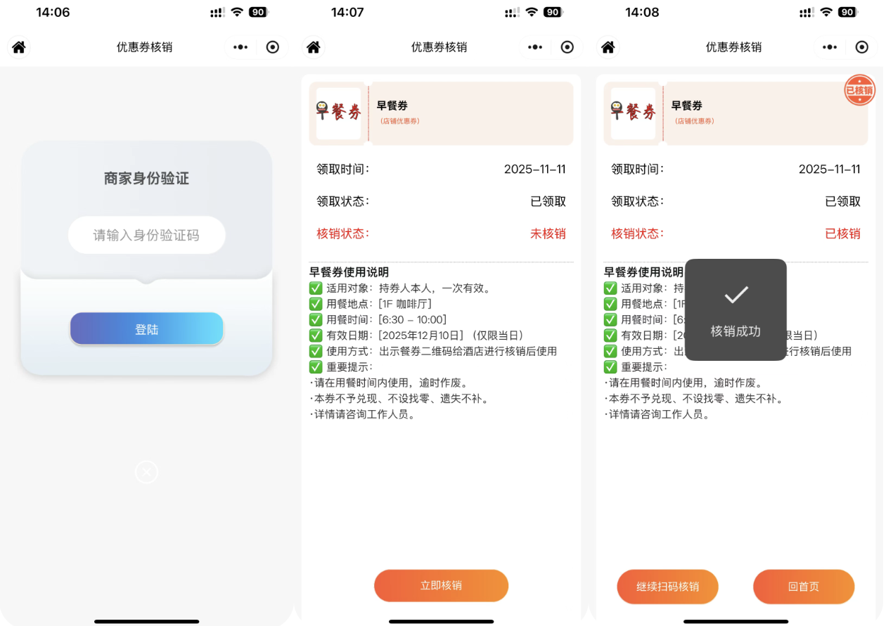 “电子餐券”功能大升级,眨眼猫智慧会务小程序支持分人群精准发放餐券、1秒核销、自动统计。