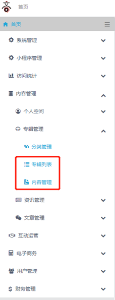 1.基本设置:首先我们要建立自己的内容,在首页里的【专辑管理】中的【专辑列表】或者【内容管理】中建立并查看。