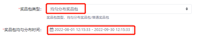 管理员均匀分布奖品包让N个奖品在固定时间段内按时段平均发放出去,用户在任何时间来参与抽奖都有机会中奖。它的具体设置过程如下图示例: