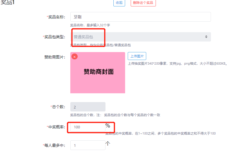 Tips:奖品包的中奖概率,在1~100之间,多个奖品包的中奖概率之和不得大于100。