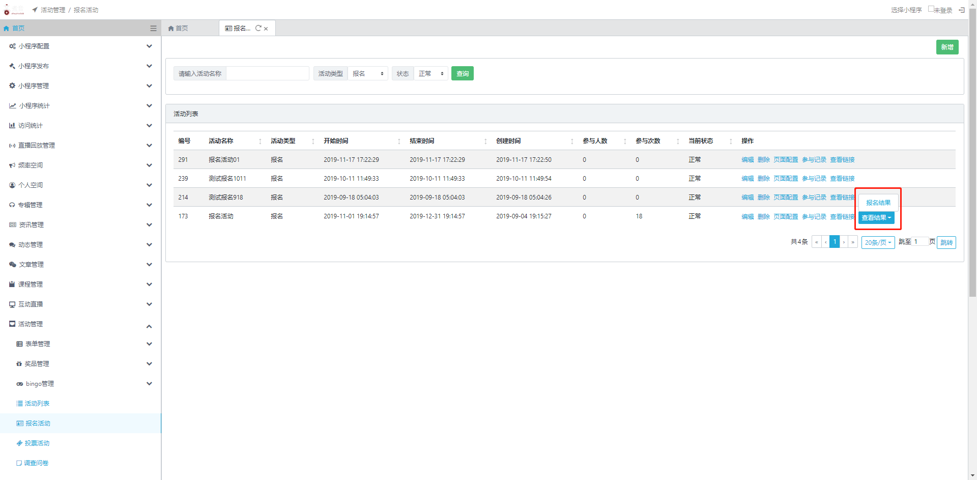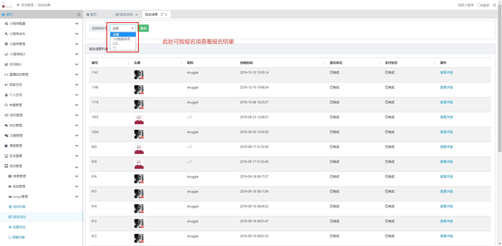 5.查看结果:在活动列表页点击操作栏中的【查看结果】选择【报名结果】即可查看此活动的参与结果,报名结果列表包含所有报名者的报名记录和详情。