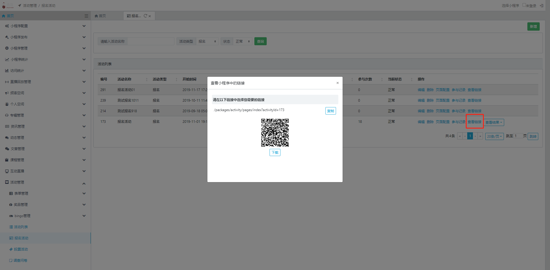 4.查看链接:在活动列表页点击操作栏中的【查看链接】即可查看此活动的链接地址信息。