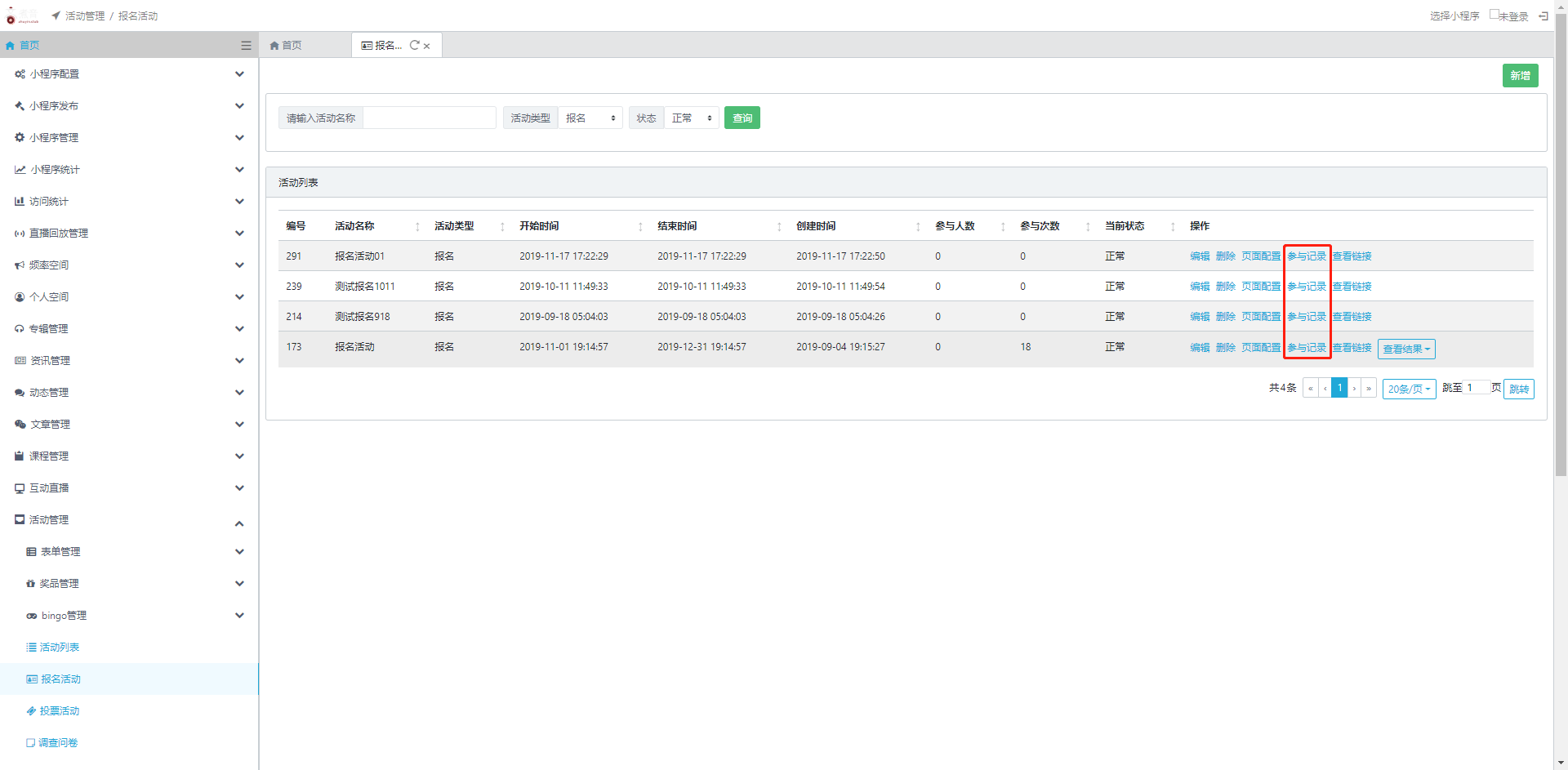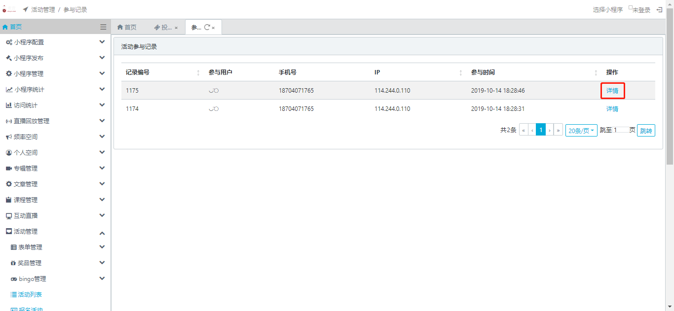 3.参与记录:在活动列表页点击操作栏中的【参与记录】即可查看此活动的参与记录信息。