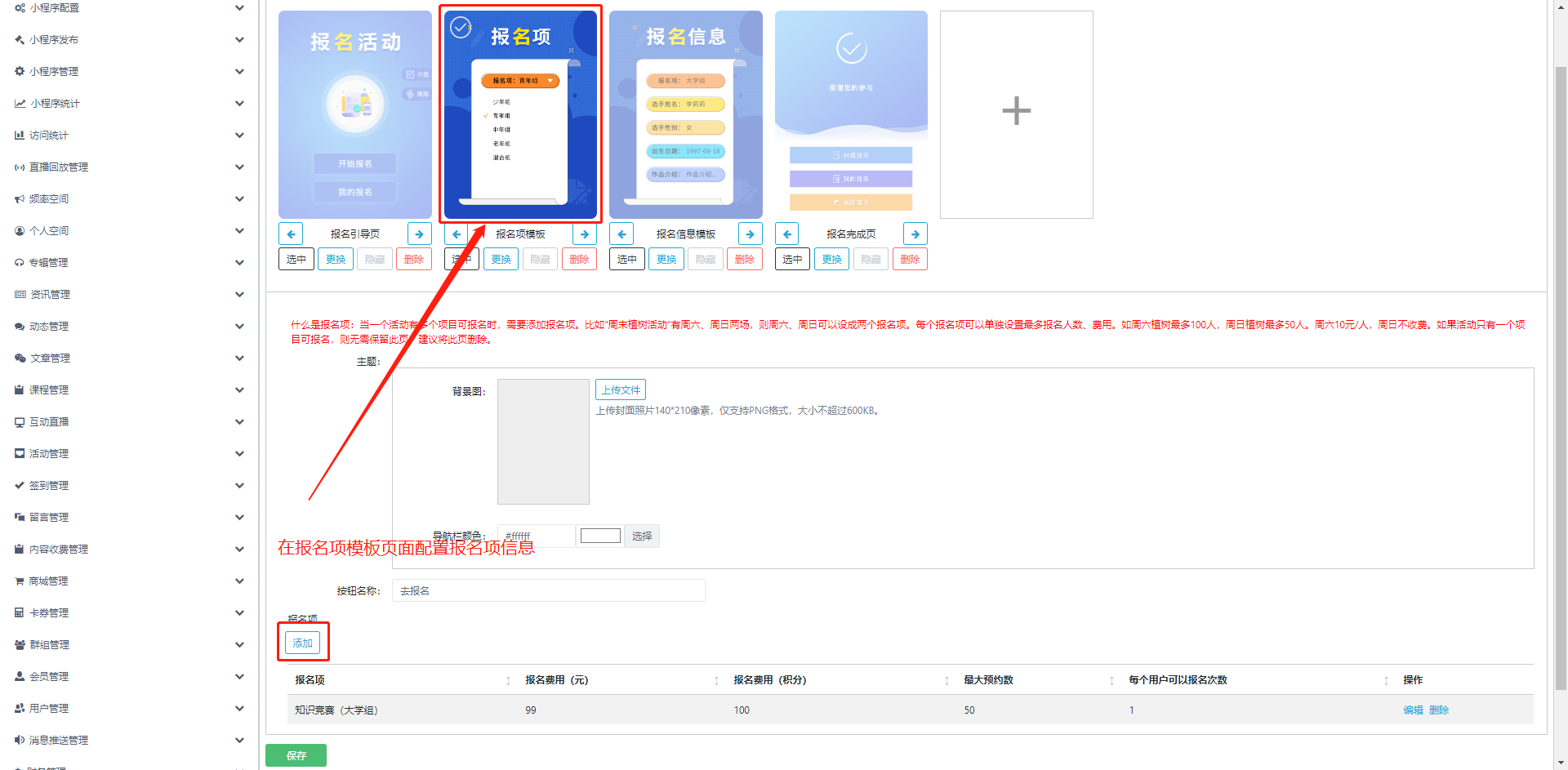 在上方页面部分选中【报名项模版】页,再点击下图左下【添加】按钮,即可添加报名项。