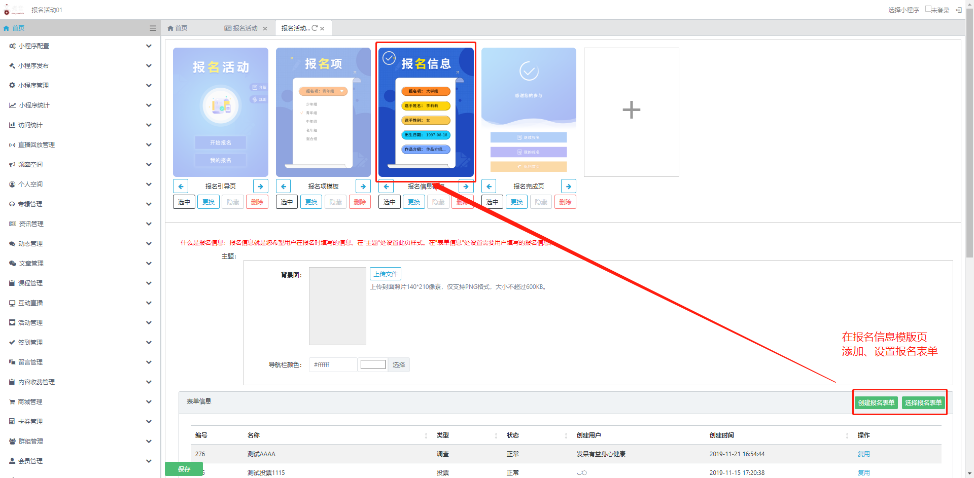 点击右下方【创建报名表单】按钮设置报名信息。(设置完每个页面不要忘记点击保存哦)