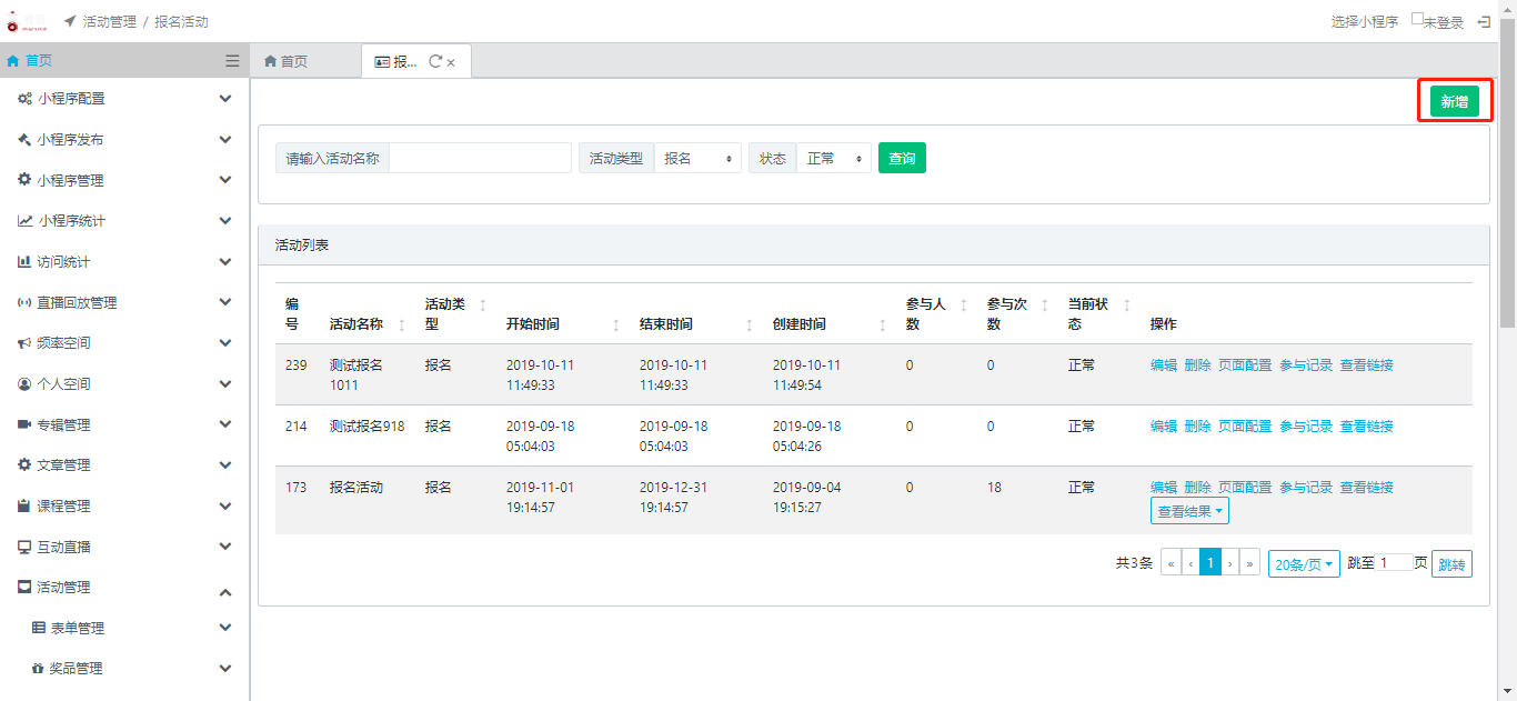 1.创建和编辑活动:登录后台后依次点击左侧导菜单【互动运营】→【活动管理】→【报名活动】进入报名活动列表页,然后点击右上角【新增】按钮进入活动创建页面。