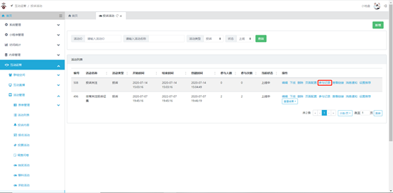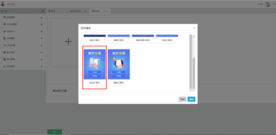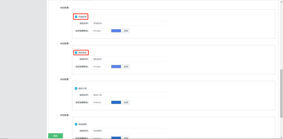 2.页面配置:活动保存成功之后可返回活动列表页面或进入活动配置页面,每个活动必须完成相关页面配置。活动配置页面会根据所选择的活动类型默认对应的模版,主题部分可以更改背景图和导航来颜色。
