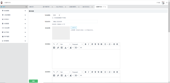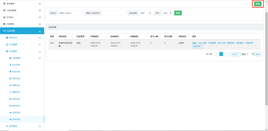 1.创建和编辑活动:登录后台后依次点击左侧导菜单【互动运营】→【活动管理】→【投诉活动】进入报名活动列表页,然后点击右上角【新增】按钮进入活动创建页面。