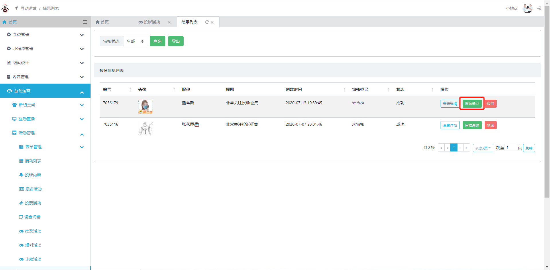 点击【审核通过】用户的内容才会出现在投诉活动里,供所有人查看,点击【驳回】可以把原有上传的内容删除。