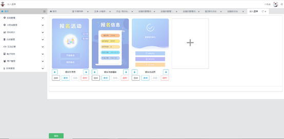 2.页面配置:活动保存成功之后可返回活动列表页面或进入活动配置页面,每个活动必须完成相关页面配置。活动配置页面会根据所选择的活动类型默认对应的模版,主题部分可以更改背景图和导航来颜色。