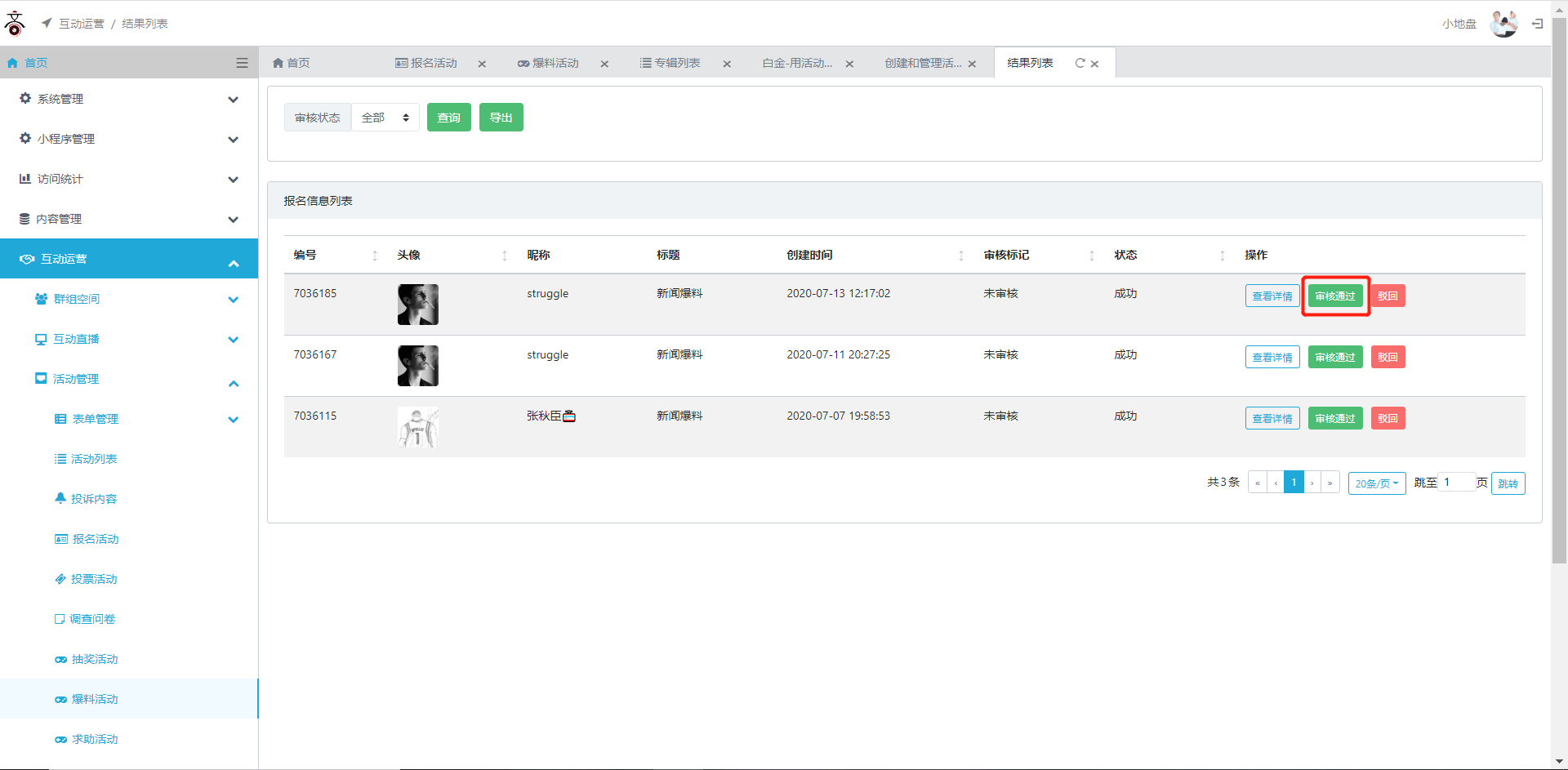 点击【审核通过】用户的爆料才会出现在新闻爆料里,供所有人查看,点击【驳回】可以把原有的爆料删除。
