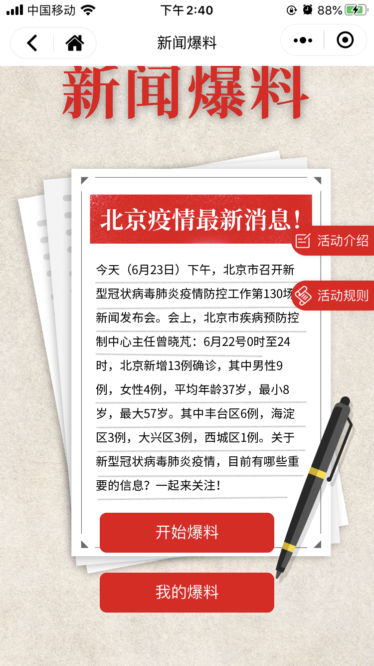 2.具体到当前管理的小程序如何应用新闻爆料活动,请参考该小程序具体说明,或咨询管理员。