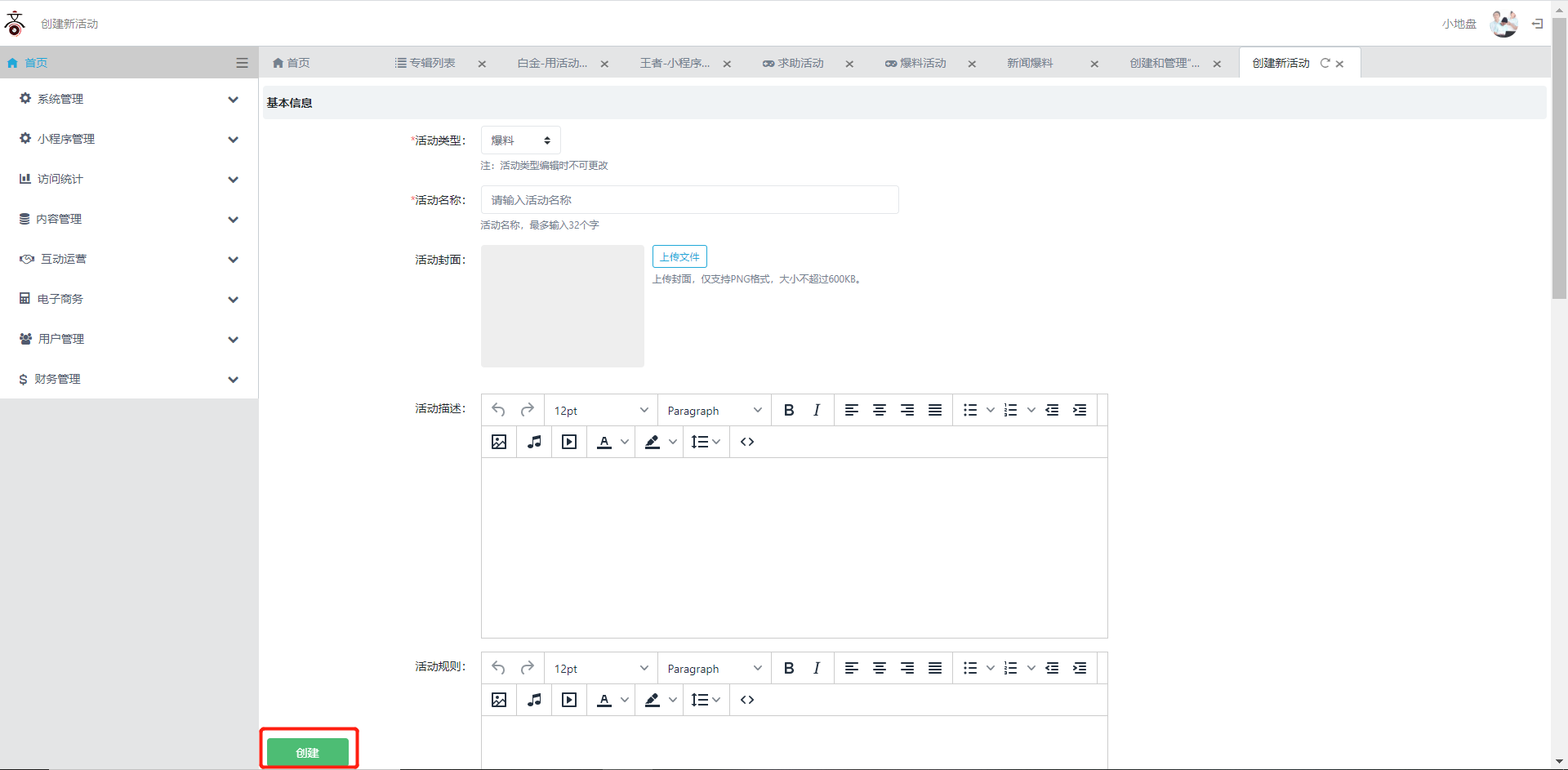 1.创建和编辑活动:登录后台后依次点击左侧导菜单【互动运营】→【活动管理】→【爆料活动】进入报名活动列表页,然后点击右上角【新增】按钮进入活动创建页面。