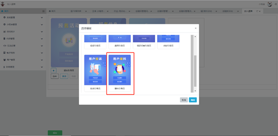 点击页面中的【+】按钮,在弹窗上方页面部分选中【引导页】,选择【爆料引导页】,再点击下图左下【确定】按钮,即可添加爆料模板。