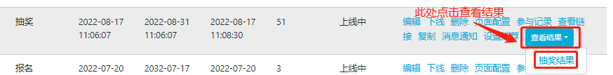 当您的奖品有红包时,找到相应的抽奖活动,在右边找到查看结果按钮(具体位置如图1所示),点击抽奖结果即可进入结果展示页面,下滑至中奖名单列表,如红包未发送成功,右侧会出现蓝色的领取二字(如图2所示)。
